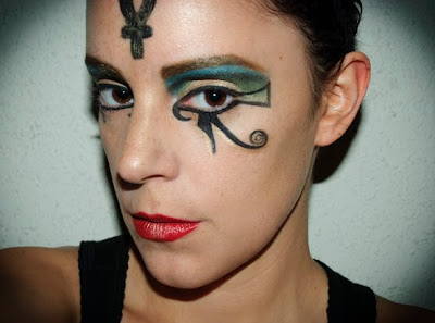 To start I have to say that in ancient Egypt the only color they have for makeup it was the color that came from gemstones, for that the only color were green, blue, gold and red. These are the color I´ve used for this look.