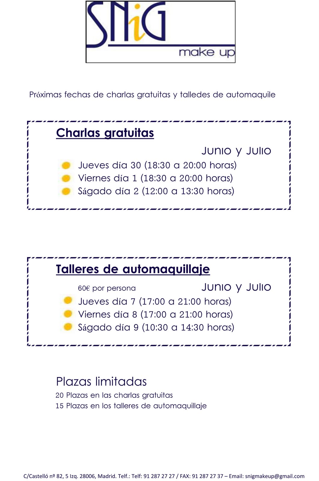 Para más información manda un correo electronico a snigmakeup@gmail.com, tanto las charlas como los talleres de automaquillaje son impartidos en la Comunidad de Madrid.