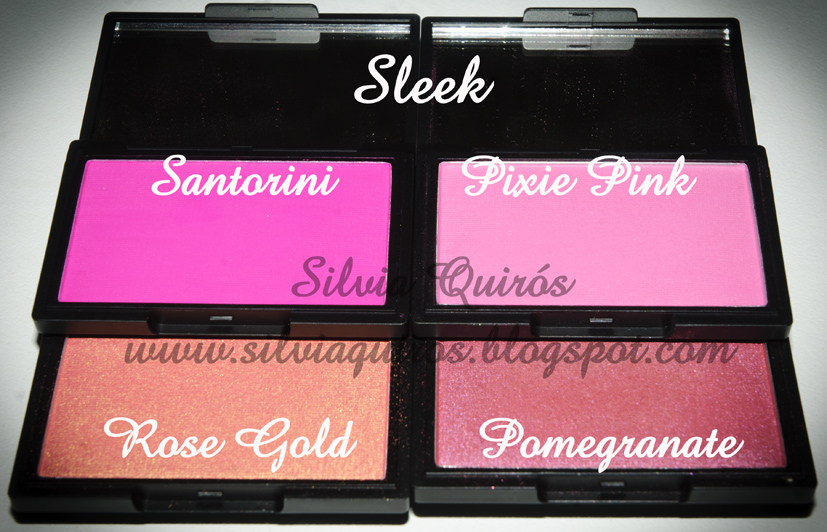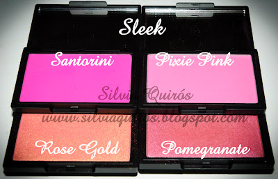 These are one of my favorites blushes, Sleek blushes, I have two matte shades and two shimmer shades. The matte shades are Santorini a neon pink very very bright from the Mediterranean collection and Pixie Pink a softer pink but still strong pigmented pink, both very beautiful colors but you need to be careful when applying them. The two shimmer shades are Rose Gold a gorgeous rose tone with a gold finish perfect to give that special finish to your skin in your evening look, and Pomegranate a purple blush with a pink and silver finish, amazing blush.