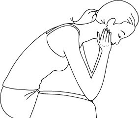 1. Sentada, coloca los codos sobre las rodillas con los pies apoyados en el suelo. Apoya la frente en la palma de las manos relajando los músculos del cuello. Manten cada posición durante 10 segundos.