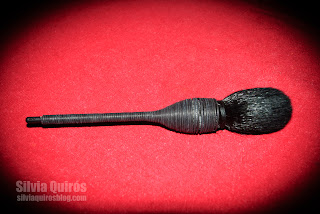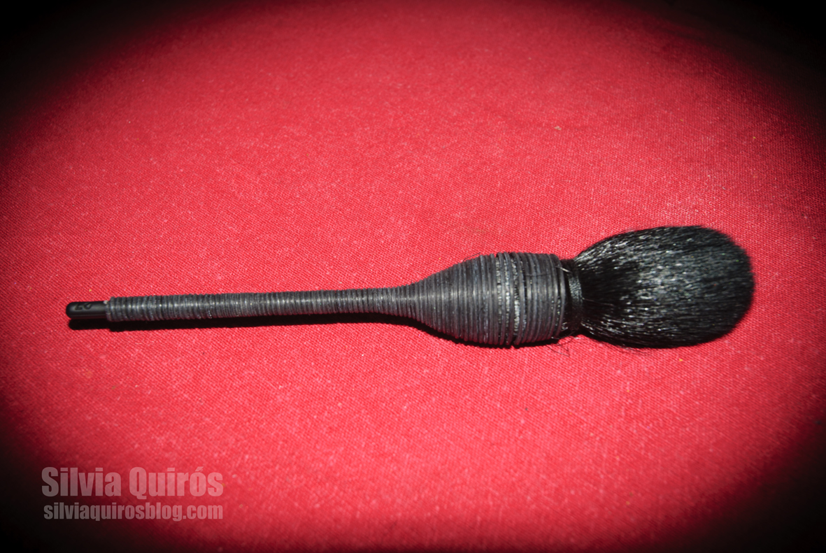 Es una brocha artesanal que tiene una forma de lágrima, siendo un poco más ancha en la base y afinándose llegando a la punta, con cerdas de pelo de cabra negra con un mango de wisteria negra, planta trepadora.