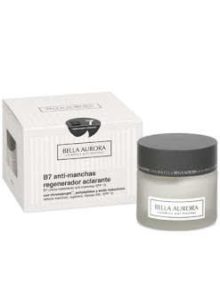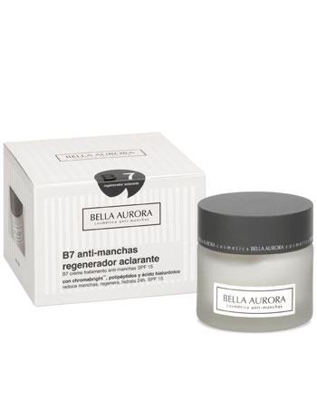 El primero es una crema hidratante de día anti manchas B7, regenerador aclarante, que aclara las manchas, unifica el tono de tu piel, aporta luminosidad y previene de la aparición de nuevas manchas, con un factor de protección solar SPF15.