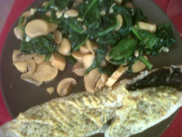 *Revuelto de espinacas y champiñones al ajillo y pescadilla al papillote.