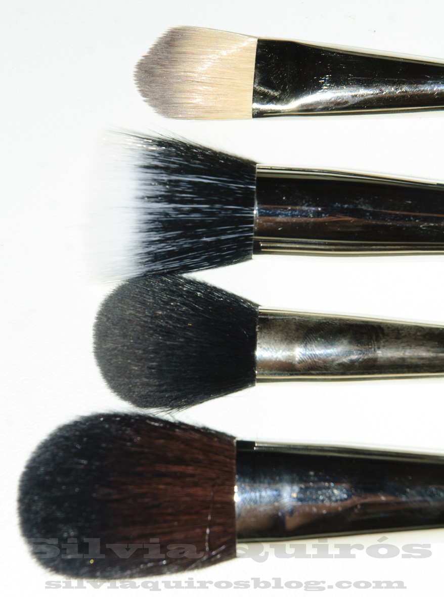 Estas son las brochas de rostro. Una de polvos, una más pequeña de polvos o colorete, una mofeta o duofibras, una de base de maquillaje y una pequeña sintética para corrector u otros productos en crema.