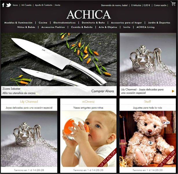 Achica es una tienda online del Reino Unido caracterizada por tener promociones de hasta un 70% de descuento en marcas exclusivas de objetos de diseño, accesorios de moda, electrodomésticos, viajes etc con productos más exquisitos cuidadosamente seleccionados por los expertos de Achica en las secciones de Cocina, Dormitorio & Baño, Accesorios para el Hogar, Jardín & Deportes, Niños & Bebés, Accesorios fashion y Arte & Objetos.