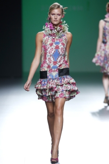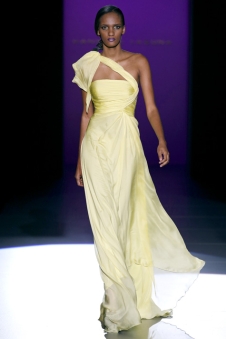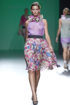 El desfile de Hannibal Laguna con colores fucsia, amarillo, morado, tornasonado, encajes, negros, faldas abuñonadas, palabras de honor, vestidos entalladas.