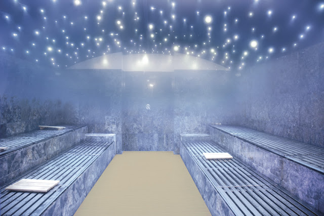 La zona termal cuenta con varias salas, esta en particular es una sauna de vapor con cromoterapia, todo un lujo estar aquí sentada un rato al día.