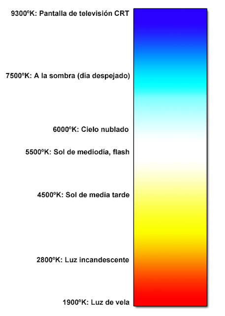 For example the shadow has a temperature of 8000º, the cloudy day has around 7500º-7000º, the medium natural light or flash or the balanced light has around 5200º-5500º, the tungsten light as a continuos light has around 3000º and as you can see on the scale the sunset or sunrise has the lower temperature.