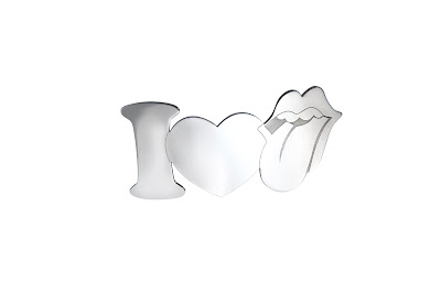 Con la forma de un disco de vinilo con el motivo de la lengua sacada en metal, y esmalte rojo.