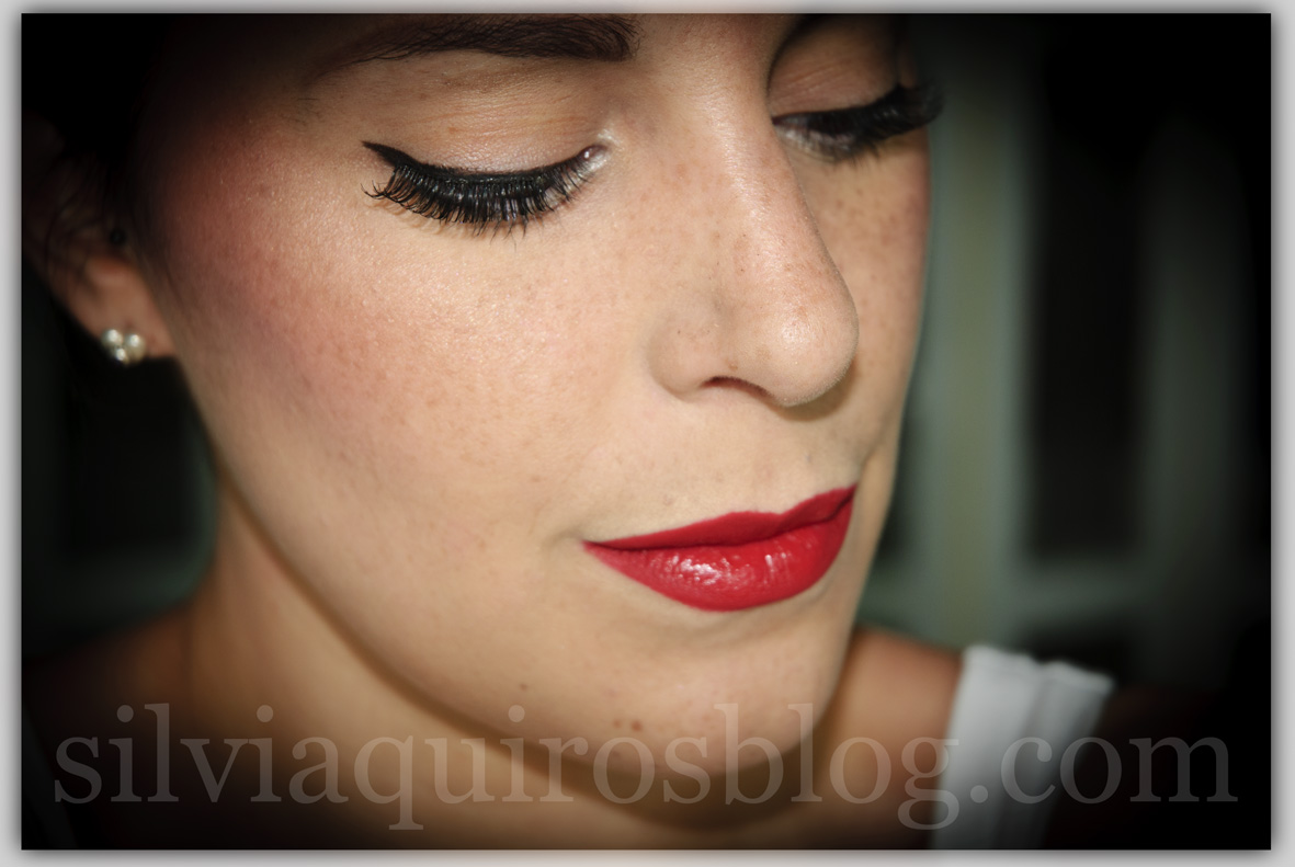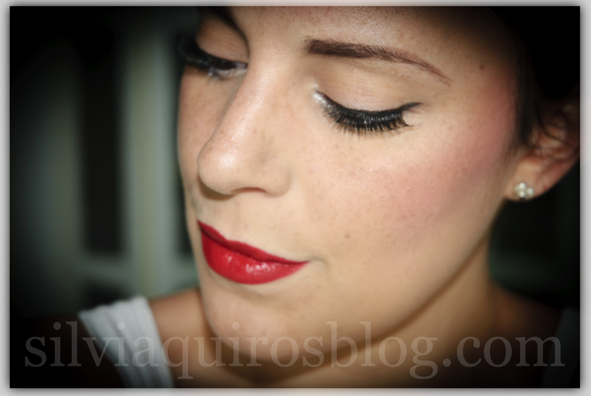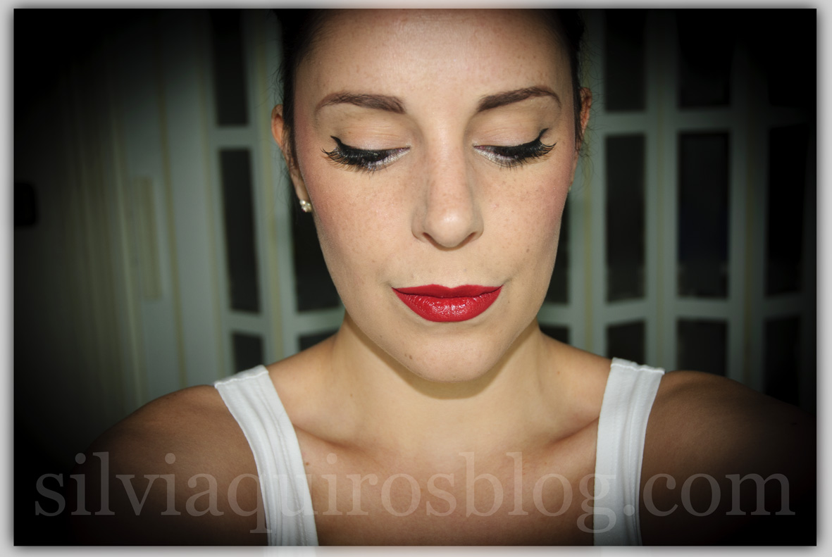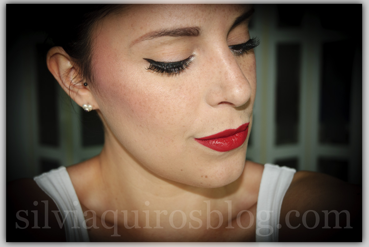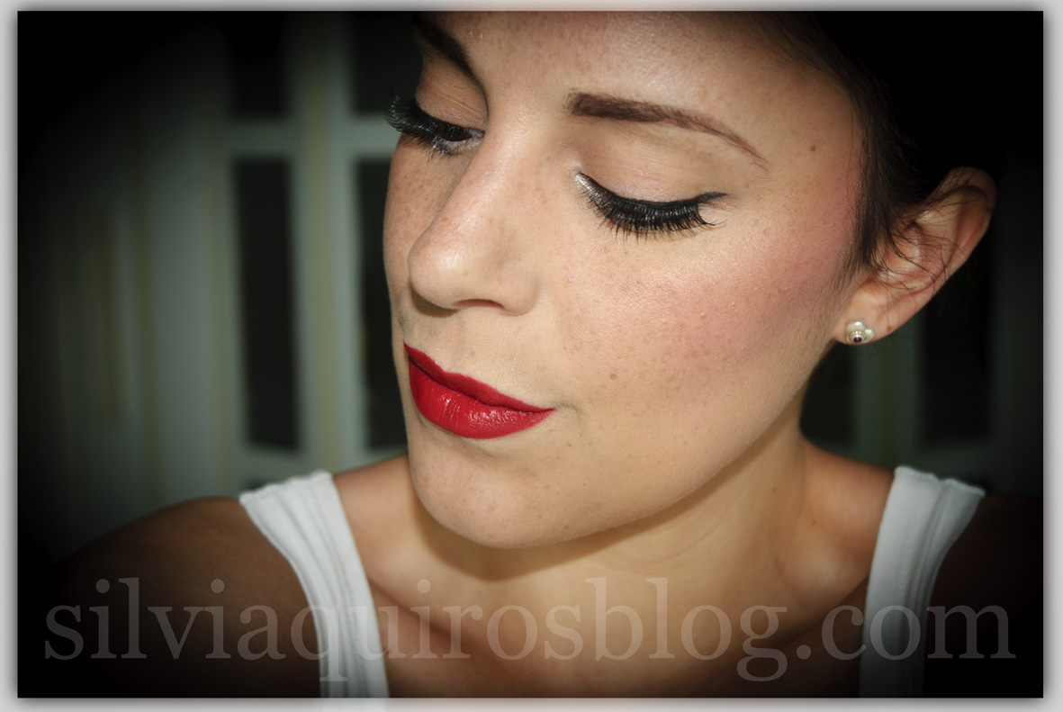 Un look con mucho glamour con labios rojos y eyeliner que con un par de toques cambiamos a un look más intenso en los ojos y los labios nude.