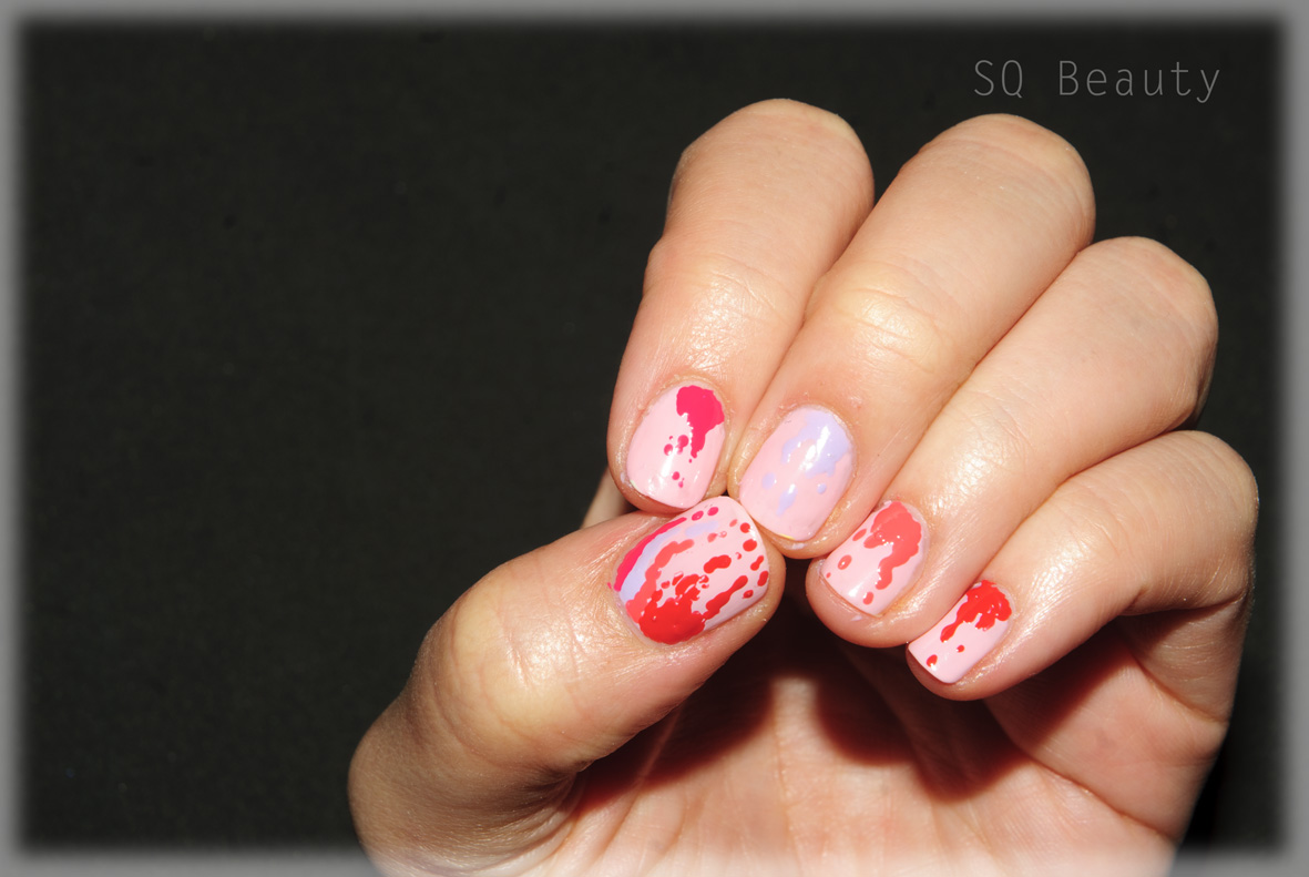 y dividiendo 4 tonos en cada mano, haremos un diseño de gotas de pintura en cada uña, usando una laca en cada uña y las cuatro en el pulgar.