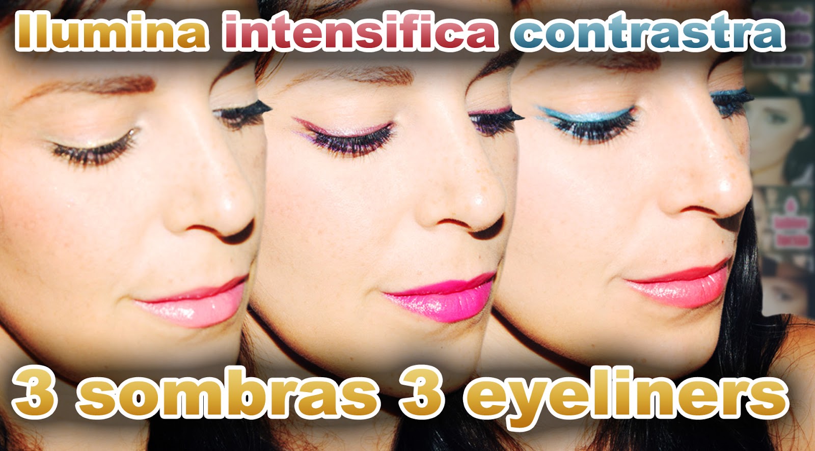 Y para demostraros esta técnica tan chula voy a crear tres eyeliners diferentes de tres sombras diferentes, usando una dorada para iluminar, una morada para intensificar y una azul para contrastar.