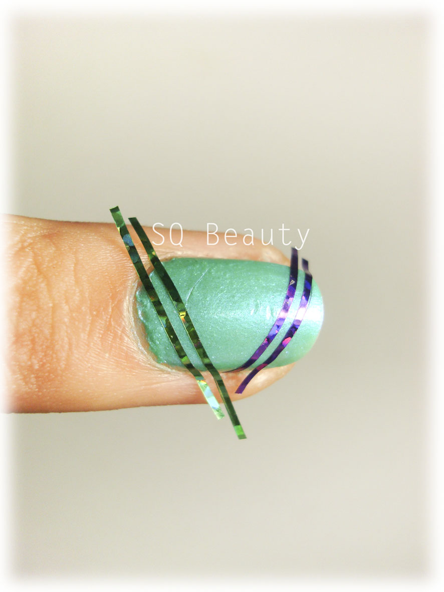 Una vez tengamos todas las cintas aplicadas añade el color de la laca de uñas que llevan solo las dos uñas, osea el opuesto del color base que lleva las uñas con las cintas, y añade laca de uñas entre las cintas paralelas, como veis en la foto.