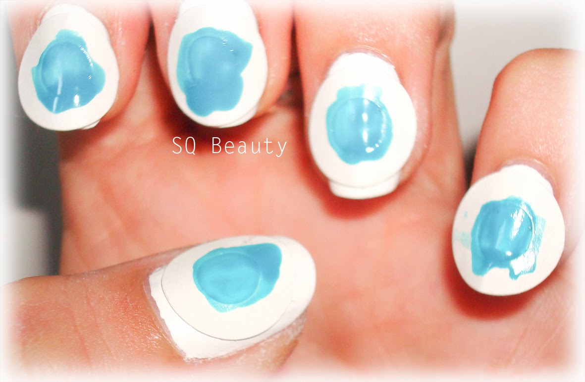 3. Coge la laca de uñas que vayas a usar para la pupila, en este caso yo he usado una azul, y rellenamos el punto central, el hueco central de las pegatinas y lo dejamos secar.