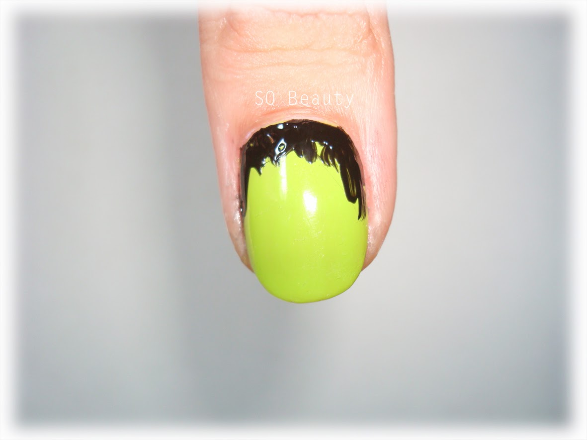 2. Cogemos la laca negra y empezados a dar los detalles, empezamos creando un efecto de cabello en uno de los bordes de la uña, yo lo he hecho en la parte de la cutícula pero puedes hacerlo al contrario, en la zona de la punta de la uña, este detalle no será uniforme sino con efecto de puntas de pelo y bajaremos por el borde que sería la zona de las patillas.