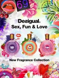 Desigual, Sex, Fun & Love, los primeros perfumes de la marca con su señal de identidad por los cuatro costados, con tres opciones dependiendo de tu estilo, Sex más profunda con toques de frutos rojos, narciso y flor de pomelo y como toque de fondo almizcle y vainilla, Fun es el más divertido de todos con toques de arándano y melocotón blanco, con toques de fruta de pasión y con un toque de fondo de madera de teca, y Love el más dulce de todos con toques de arándano y grosella negra, romántico azahar y benzoína y con tono de fondo praliné y haba tonga.