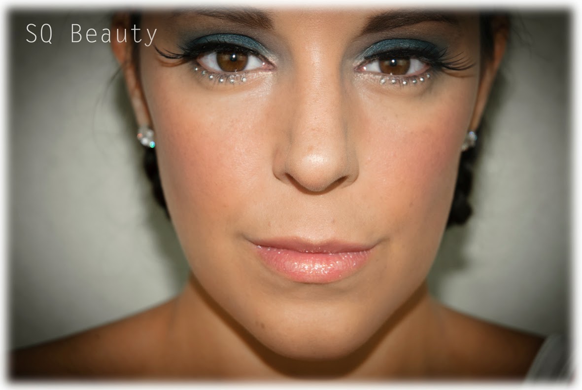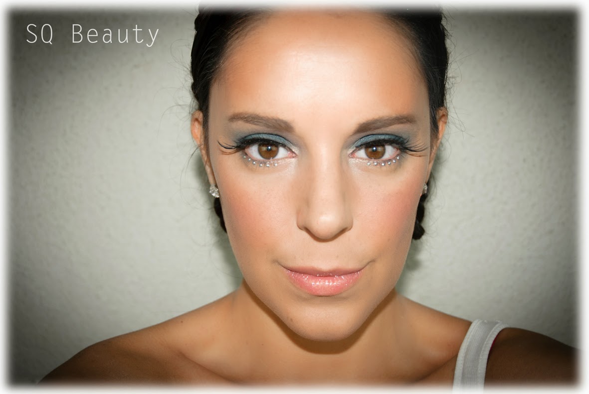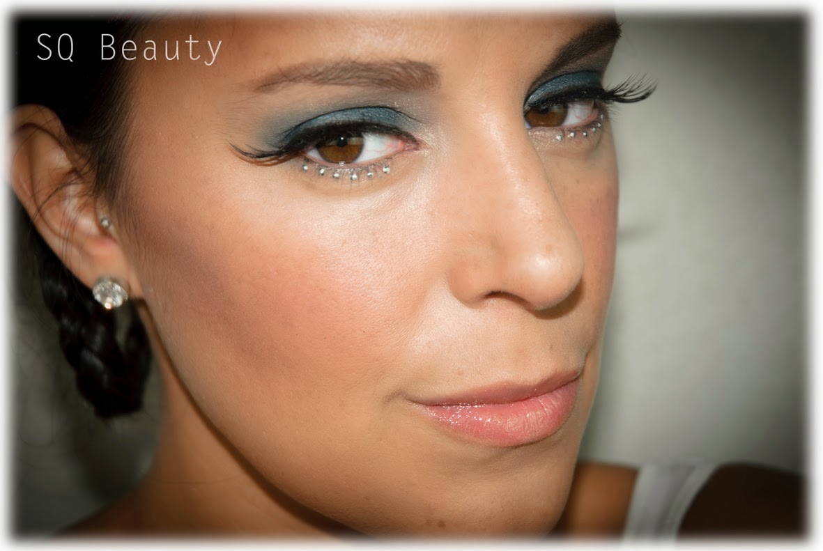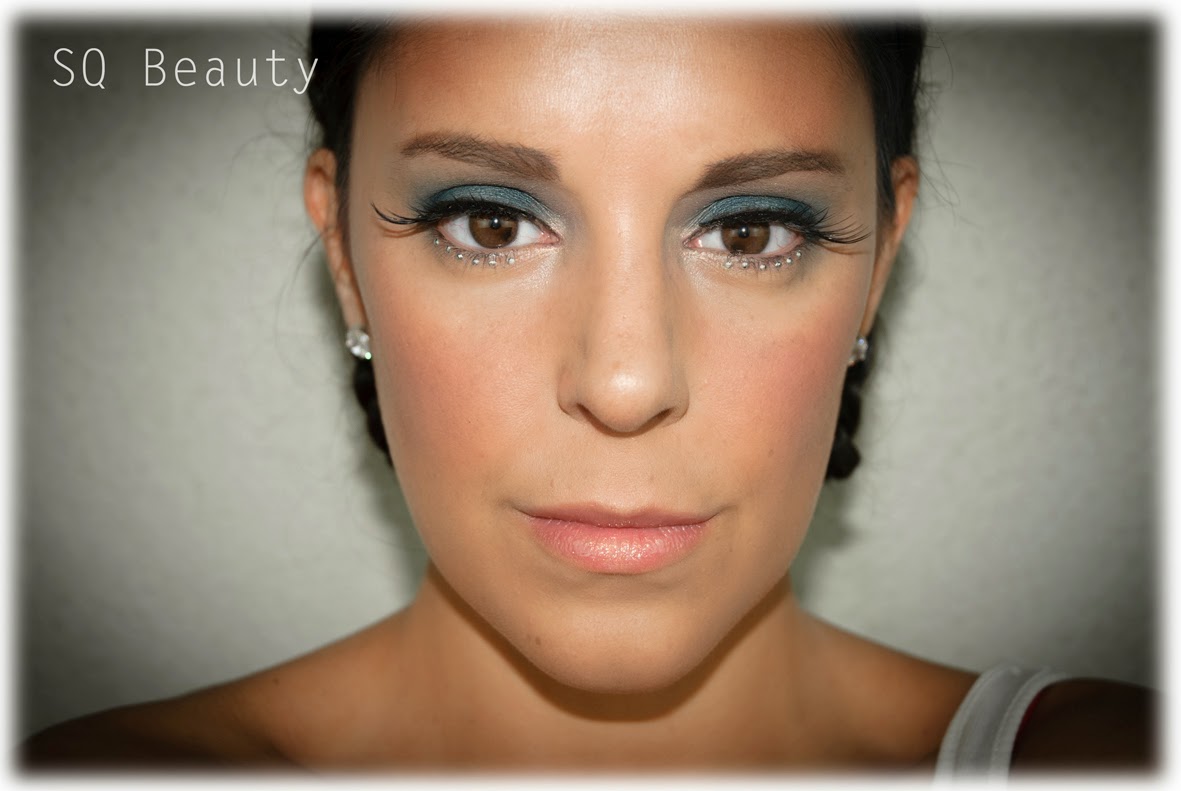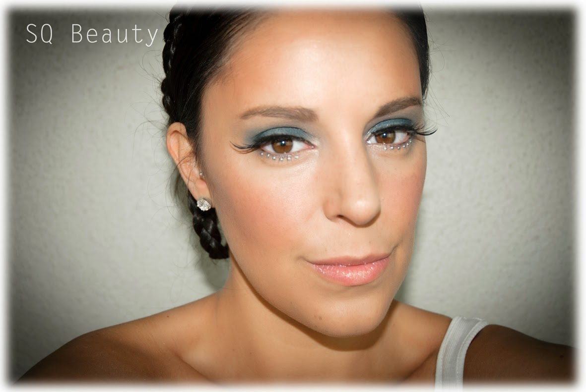 Lo más llamativo de este maquillaje son las súper pestañas postizas por efecto más grande en la parte externa de los ojos y la línea de piedrecitas pegadas en la línea inferior de pestañas.