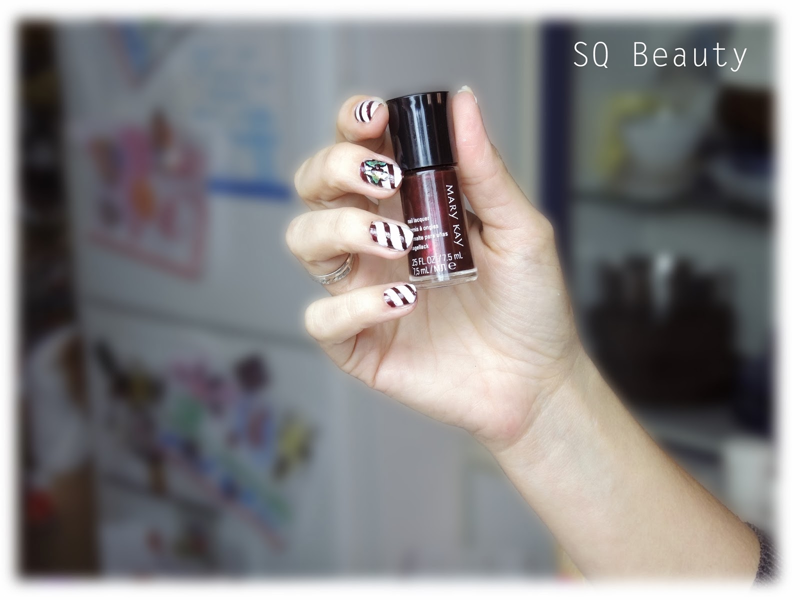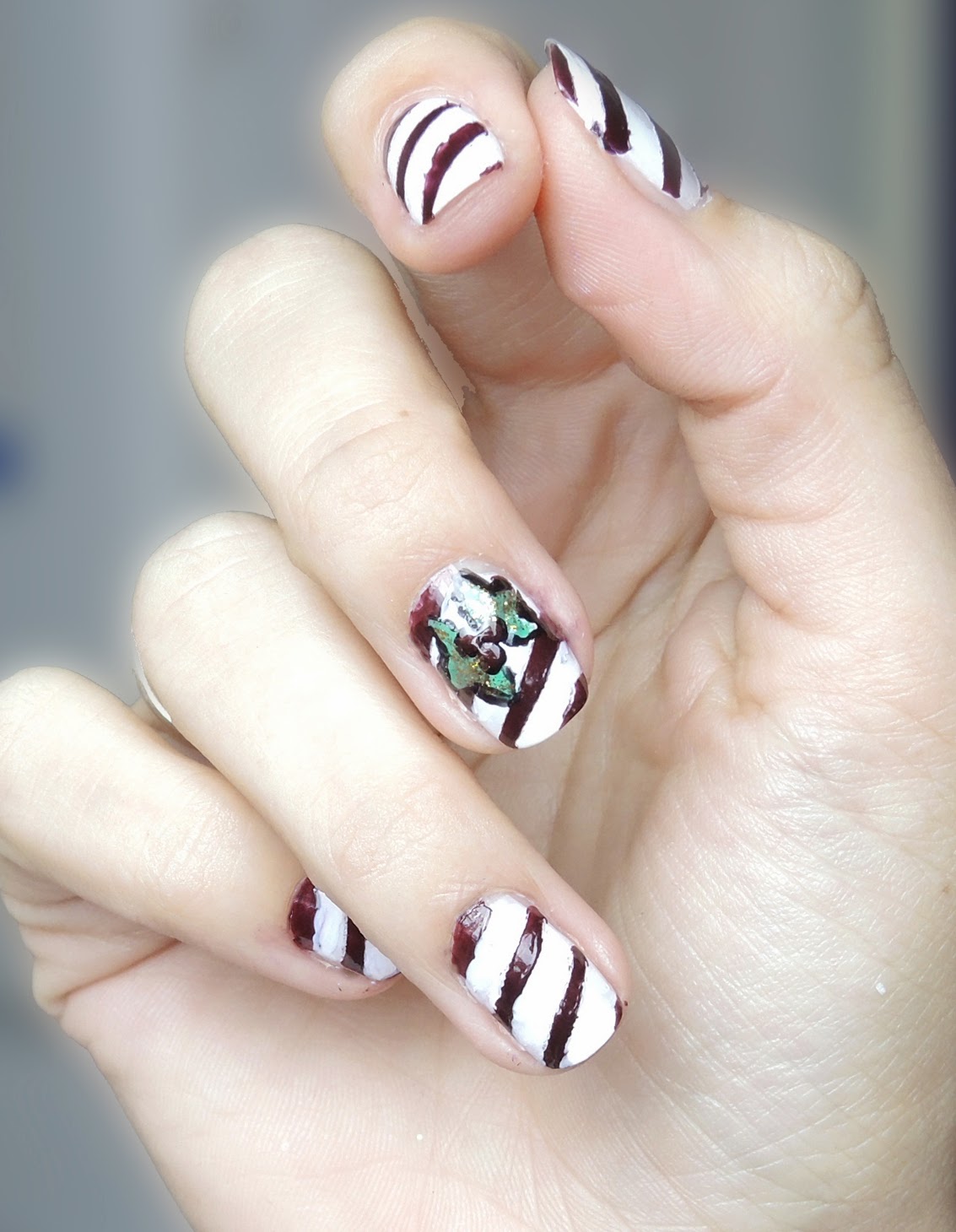 En esta manicura nos hemos decantado por un diseño muy americanizado recreando uno de los palitos de caramelo que tanto se ven en esta época en la cultura anglosajona, con un detalle de muérdago, muy fácil y muy llamativa.
